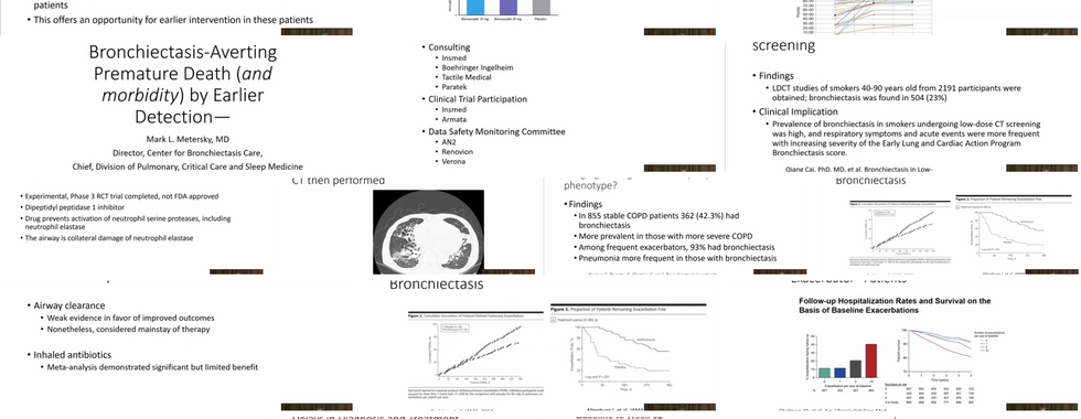 Dr. Mark L. Metersky, MD emphasized the importance of early detection and treatment of bronchiectasis. He noted that delays in diagnosis are common and detrimental. Although there is no cure or FDA-approved therapies, early diagnosis can enhance the quality of life and decrease exacerbations, which increase hospitalization and mortality rates. In addition, he highlighted the utility of low-dose CT scans in early identification and stressed the need for timely evaluation and intervention. Dr. Metersky also discussed promising new therapies and the role of pulmonologists in managing the disease.
